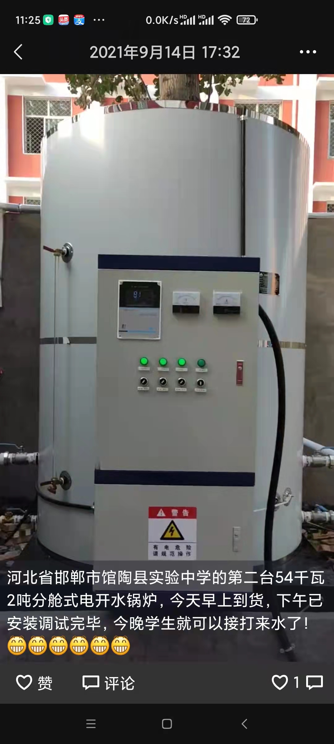 館陶縣實(shí)驗(yàn)中學(xué)就是原來(lái)的館陶縣第二中學(xué),位于邯鄲市館陶縣文衛(wèi)街089號(hào),2021年8月份訂購(gòu)兩臺(tái)54千瓦兩噸電開(kāi)水爐,分別于2021年8月29日和9月14日安裝調(diào)試完畢,交付校方使用!
